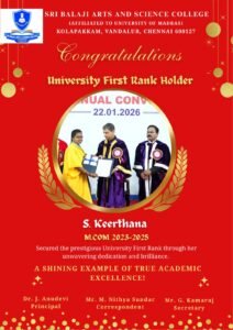 The Management, Principal, and Staff of the college are delighted to announce that Ms. S. Keerthana, a student of M.Com (2023–2025), has secured the University First Rank in the University Examinations.
