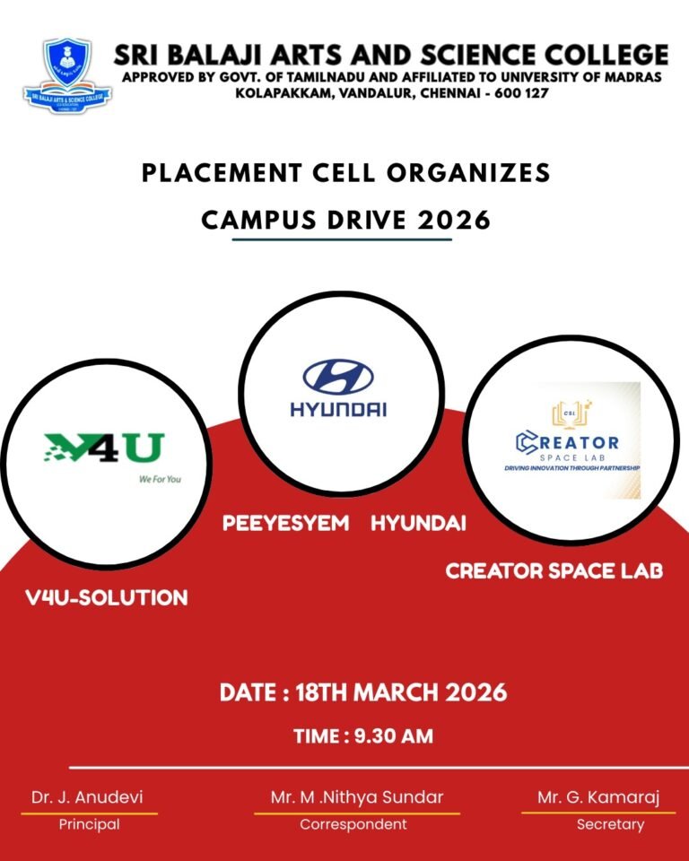 The Placement Cell of Sri Balaji Arts and Science College successfully organized a Campus Drive 2026 on 18th March 2026 at 9:30 AM at the college campus, Kolapakkam, Vandalur, Chennai.